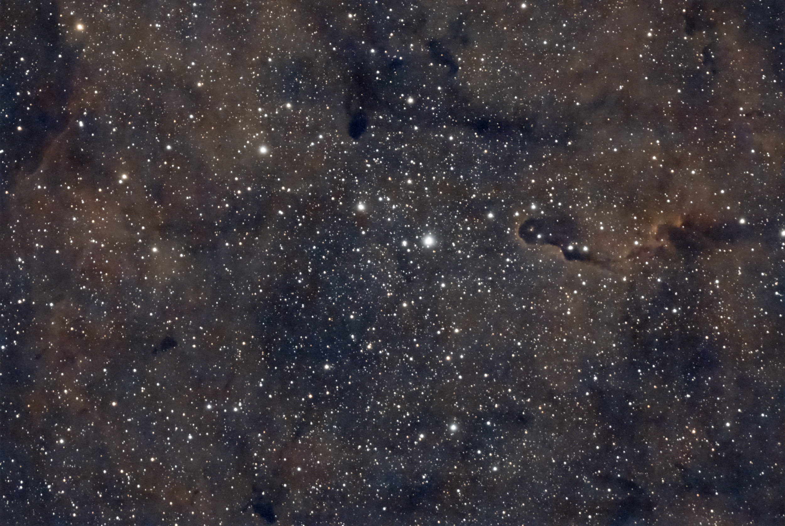 But why did I have to take so many images to get this picture? IC 1396, the Elephant’s Trunk Nebula is not particularly faint, but the contrast is somewhat low. The extra exposure time helped bring out the subtle variations in brightness.