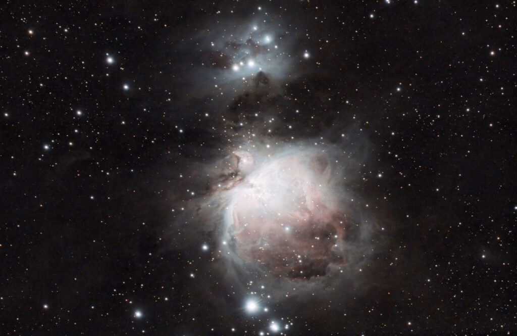 Messier 42, the Orion Nebula, and its neighbors Messier 43 (De Mairan’s Nebula) and NGC 1977 (the Running Man Nebula) are somewhat difficult to image due to their high dynamic range. Short exposures miss the faint parts of the nebula. Long exposures bring out the faint details but overexpose the bright parts.